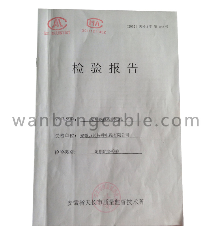 圖片名稱:檢驗(yàn)報(bào)告-塑料絕緣控制電纜 所屬企業(yè):特種電纜-安徽萬邦特種電纜有限公司專業(yè)特種電纜生產(chǎn)商 更新時(shí)間:2013.12.06